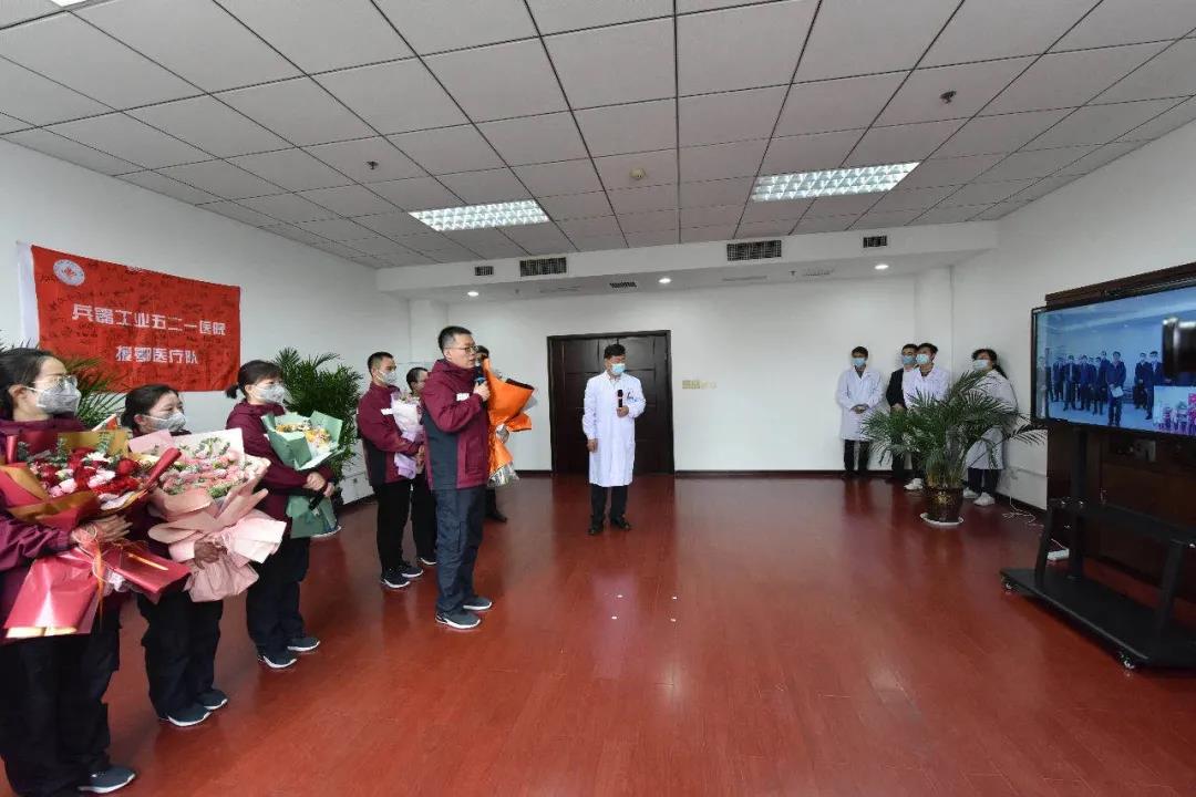 置業(yè)集團(tuán)521醫(yī)院2月2日、2月15日分兩批派出杭博、郭苓、緱豪兵、呂戈、侯永生、曹利娜、楊嬌等7名醫(yī)護(hù)人員馳援湖北抗疫一線。4月21日上午,返程隊(duì)員全部結(jié)束休整平安回院。焦開河專程視頻連線521醫(yī)院7名援鄂醫(yī)療隊(duì)隊(duì)員,代表集團(tuán)公司黨組對援鄂醫(yī)療隊(duì)隊(duì)員致以崇高的敬意和誠摯的慰問。