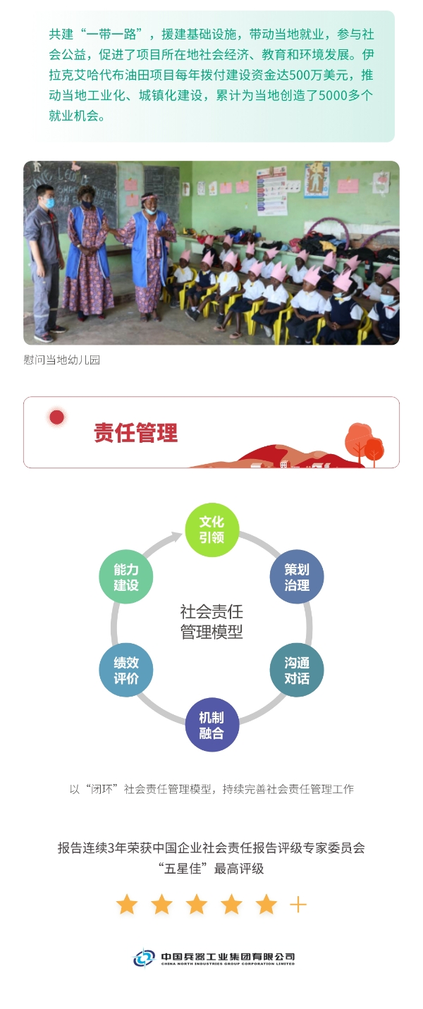近日,兵器工業(yè)集團(tuán)正式發(fā)布第十三份年度社會(huì)責(zé)任報(bào)告——《中國(guó)兵器工業(yè)集團(tuán)有限公司2021年社會(huì)責(zé)任報(bào)告》,以“用心守護(hù)和平、用力爭(zhēng)創(chuàng)一流、用情溫暖社會(huì)”為主題,從恪守強(qiáng)軍首責(zé)、服務(wù)經(jīng)濟(jì)建設(shè)、共創(chuàng)美好生活三個(gè)維度,向社會(huì)全面披露2021年度履責(zé)實(shí)踐和履責(zé)業(yè)績(jī)?!秷?bào)告》連續(xù)第三年獲得中國(guó)企業(yè)社會(huì)責(zé)任報(bào)告評(píng)級(jí)專(zhuān)家委員會(huì)“五星佳”評(píng)級(jí),兵器工業(yè)集團(tuán)成為軍工行業(yè)唯一連續(xù)11年獲得五星及五星佳最高評(píng)級(jí)的企業(yè)。 一圖解碼兵器工業(yè)的“責(zé)任力量” |