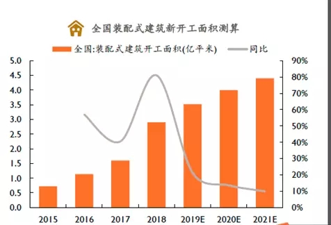 3、未來我國裝配式建筑市場規(guī)模可達(dá)萬億元受益國家政策推動,2018年我國裝配式建筑新開工面積達(dá)2.9億平方米,同比增長81%(占新開工面積13.9%),中性預(yù)測下,我們預(yù)計2019~2021年國內(nèi)新開工房屋面積為20.1億平米、19.5億平米、19.1億平米,假設(shè)裝配式建筑占比為17.5%、20.5%、23%,對應(yīng)裝配式建筑新開工面積分別為3.5億平米、4.0億平米和4.4億平米,按每平方米造價2300元計算,2019~2021年我國裝配式建筑市場規(guī)模分別可達(dá)8000億元、9200億元和10000億元(建筑整體建安工程造價,含非裝配式建筑部分)。