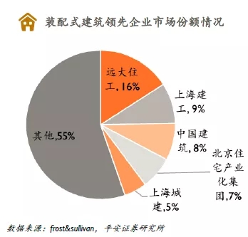 2、從企業(yè)看,國資建筑大佬占據(jù)市場從施工企業(yè)看,由于裝配式建筑并無特殊資質(zhì)要求,具備建筑工程施工總承包資質(zhì)(數(shù)量龐大)的建工企業(yè)均可承接相關(guān)建設(shè)工程,其中中國建筑、上海建工等經(jīng)營市場位于東部發(fā)達(dá)地區(qū)的龍頭企業(yè)優(yōu)先受益。2017年,按PC裝配式建筑構(gòu)件收入計,遠(yuǎn)大住工是中國PC裝配式建筑構(gòu)件市場的最大參與者,市場份額達(dá)到15.9%。市場競爭對手包括大型國有建筑企業(yè)、地方構(gòu)件制造企業(yè)和合資構(gòu)件制造企業(yè)。其他主要參與者包括上海建工、中國建筑、北京住宅產(chǎn)業(yè)化集團、上海城建等。